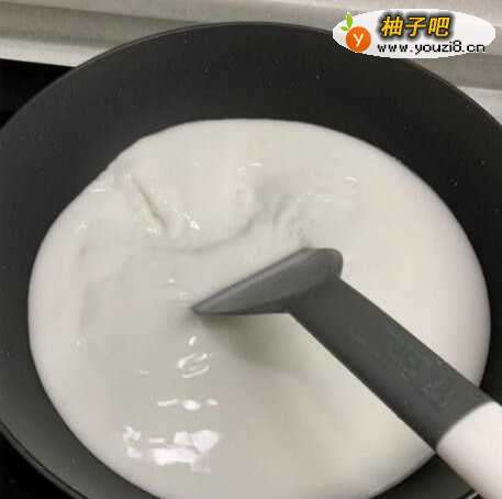 6搅拌几分钟后就可以看到淀粉开始结块了,炒至透亮关火