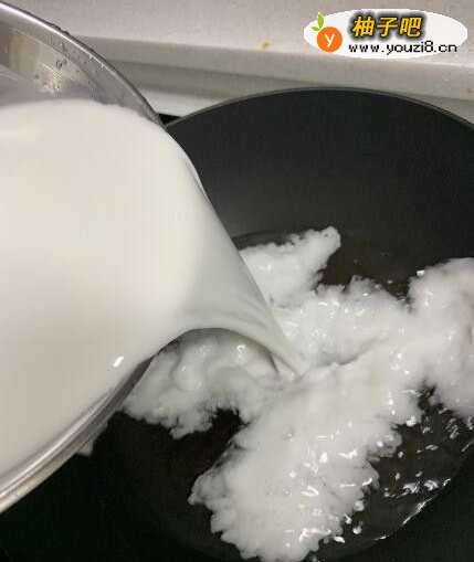 4起锅,锅里放300ml的水,水的比例不能超过1:5,然后倒入活好的面粉