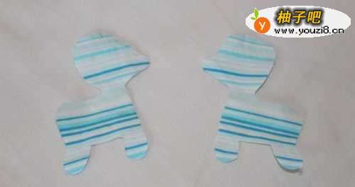 1首先如图剪下小鹿身体的布料,然后把小鹿身体缝起来,塞入棉花(如果全缝好很难翻面,所以我们要先把小鹿的头翻过来再继续缝)。