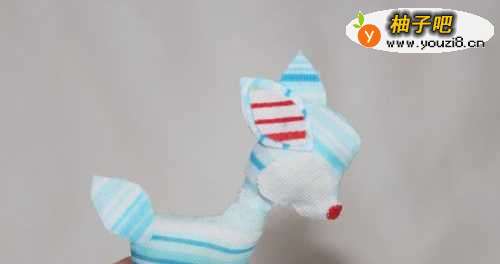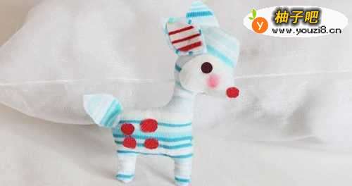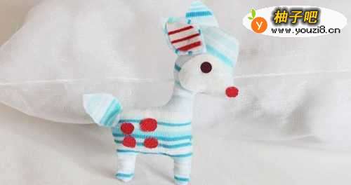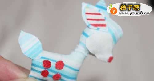 2然后给小鹿的头部粘上白色布料做脸部,之后粘上一块红色圆布料做嘴巴。