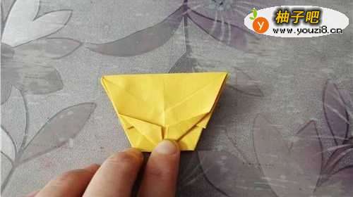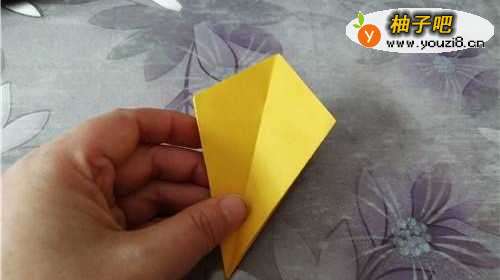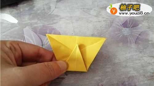 4把彩纸放平,把下侧的角上折,然后打开彩纸,把中间的折痕折一下,按照折痕折成图三的样子。