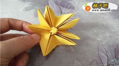 6然后按照折痕,把中间的边向下折,用手指把花瓣撑开稍微的卷一下就可以了,下面是完成图。