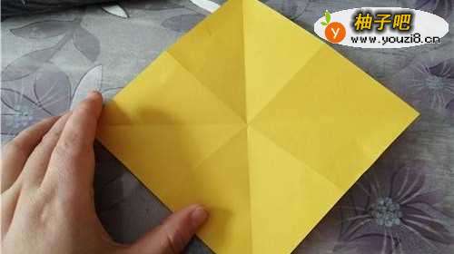 先把彩纸的中间折出米字形,按照折痕把彩纸折成图二的样子。我们把每个角都做角平分,如图三。