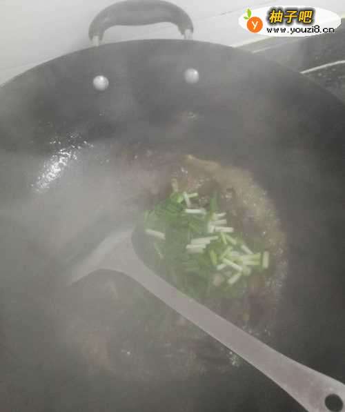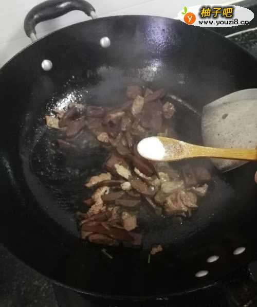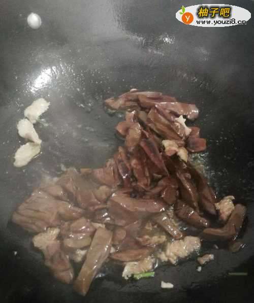 5把前面的猪血倒入锅中和猪肉汇在一起炒,