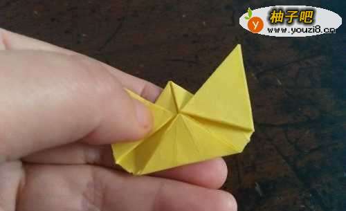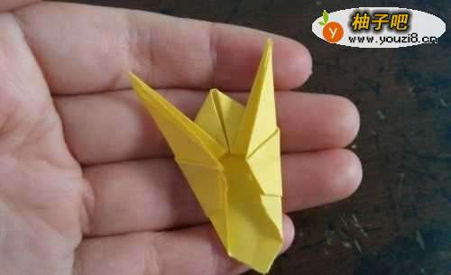 2然后再把两个角分别向内折,把纸转一下,再把刚才的两个角向外斜着向上翻折,如图二。