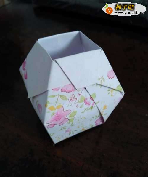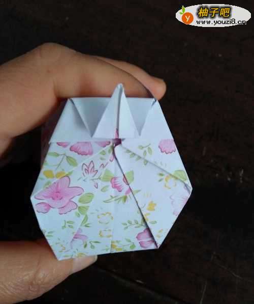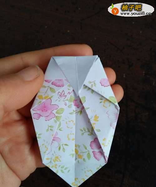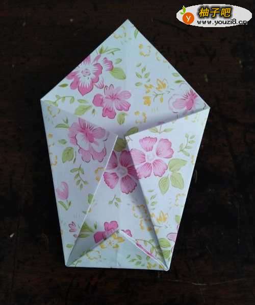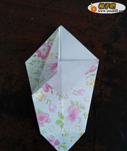 7我们把上边的尖角向下折,另一侧的同样操作。然后把彩纸都向中间折一下,用手指从中间撑开,花瓶就快要做好了。
