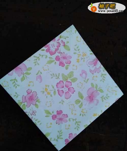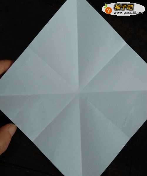 2然后再把彩纸的两条对角线分别对折后打开,我们捏住带有色彩一面的中线向外折,对角线向里折就会形成一个正方形的样子,如图所示。