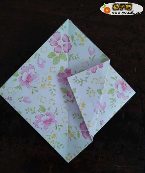 5然后我们把彩纸下边的尖角向上折,如图所示。接着再把右侧的边折向左边,把上边的角向下折。