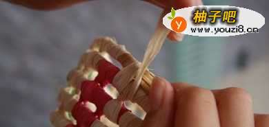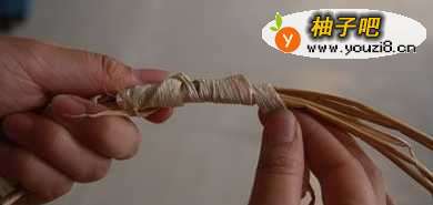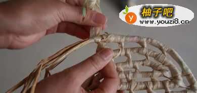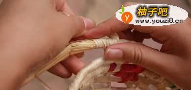 4编篮提手。找一束小麦秸秆或柳条(根据手感确定长短和粗细),用玉米皮缠裹。然后把两端剩余的玉米皮各分成两股,交叉编在篮身上,将扣系结实。