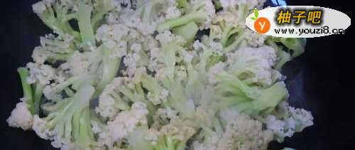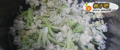 4锅中将水烧沸,把菜花倒进去焯软后捞出沥水备用。