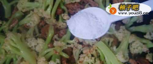 6锅中倒油,爆香蒜末后下入焯好的菜花,翻炒片刻,倒入刚才炒好的肉片,一同翻炒。