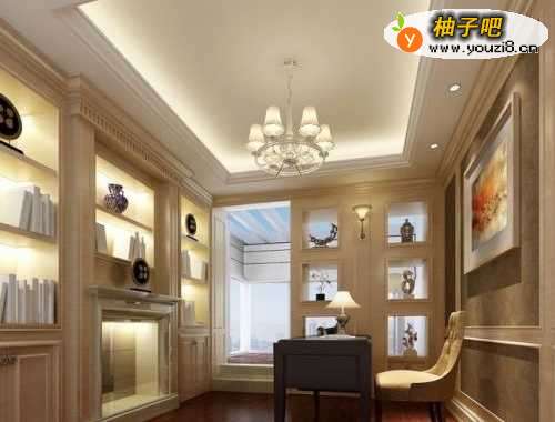 除了采光要求外,书房装修对照明效果也比较讲究,一方面,对于书桌上的台灯而已,由于人眼不能长期在强光线下看书写字,台灯光纤便不宜过强,否则对眼睛伤害太大,且最好放在阳光充足但不直射的地方。另一方面,对于书房整体照明设施而言,装修时可在顶部安装小功率的嵌入式灯具,其亮度不需要太大。