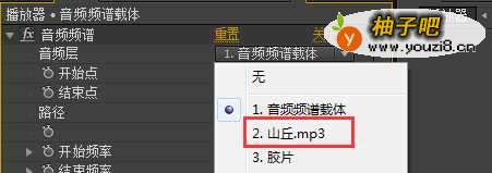 4将音频层选择为音频素材山丘.mp3,可以设置相应的频谱颜色,高度开始点结束点等等属性值,这个大家可以去试试。频谱就会跟着音乐的播放而变化着。