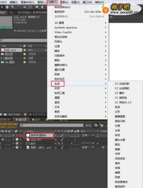 3选中音频频谱的载体固态层,添加音频频谱效果,效果-生成-音频频谱。然后对应的去设置相应的参数。