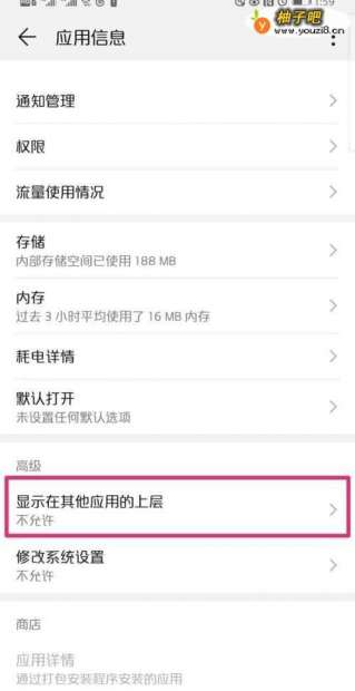 6进入手机应用信息主界面,点击显示在其他应用的上层;