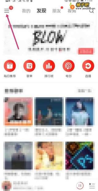2进入网易云音乐主界面,点击页面左上角的【三横】图标;