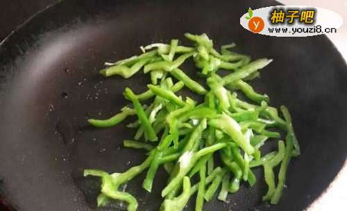 5倒入蛋汁,待蛋汁稍微成形时开够铲始翻炒,让青椒蘸上蛋汁