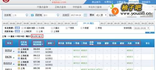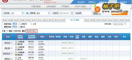 4在这里,你可以查询到从出发地到目的地的列车“数量”、各个列车的“车次”、“出发站和到达站”、“出发时间和到达时间”、“历时”以及各类座位的对应票种的价格信息。