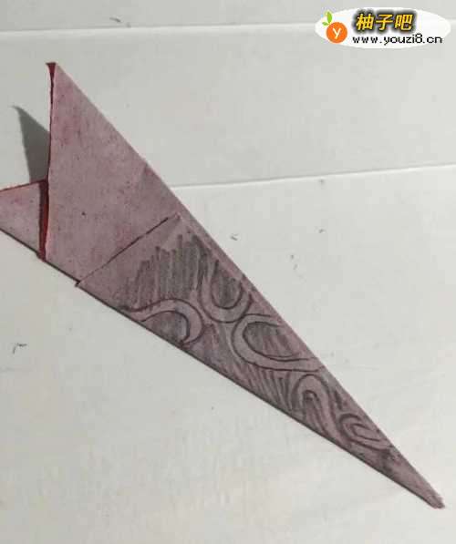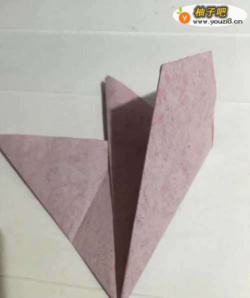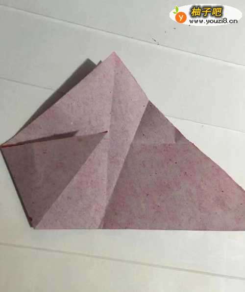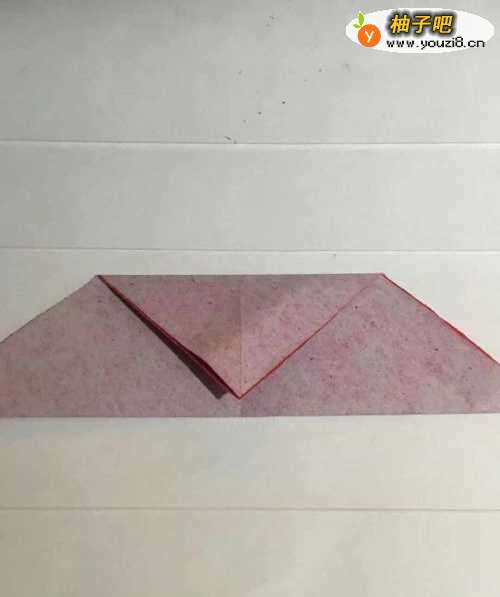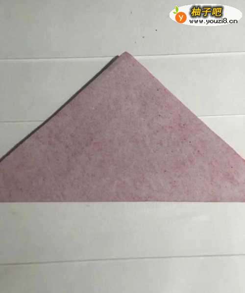 第一步 首先把一张16厘米X16厘米的正方形红色彩纸 从下向上对角折叠整齐