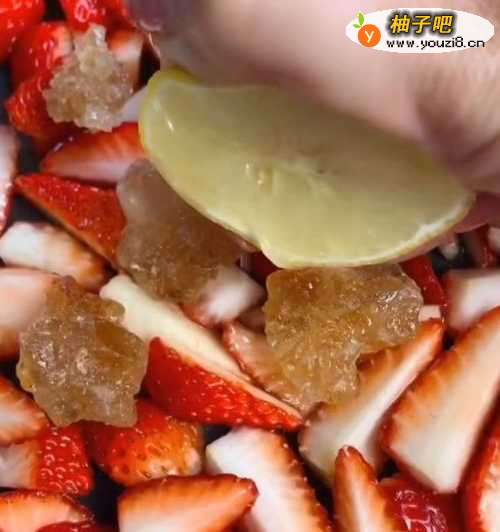 2把草莓对半切开,倒入锅中,加入一把冰糖,几滴柠檬汁。见下图