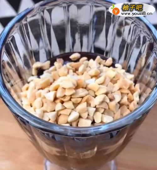 5把200克巧克力隔水融化,化后倒入杯中,加入坚果碎。搅拌均匀。见下图