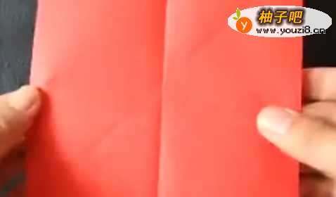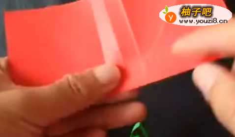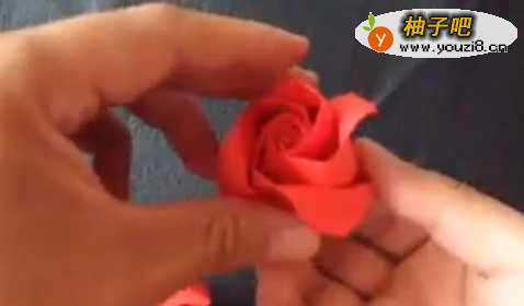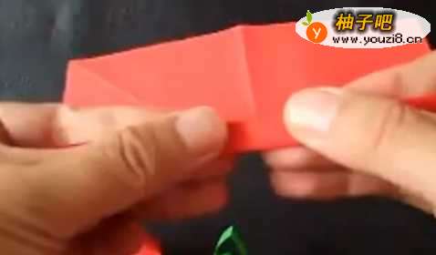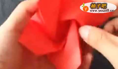5接下来展开后将一个折边拉起来,向邻边压过去,就会出现玫瑰花的雏形。
