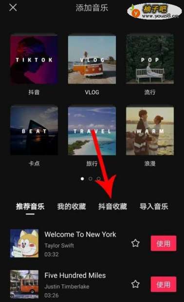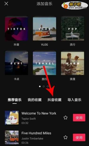 2打开添加音乐界面点击“抖音收藏”,然后点击抖音音乐右侧的“使用”按钮,位置见下图。