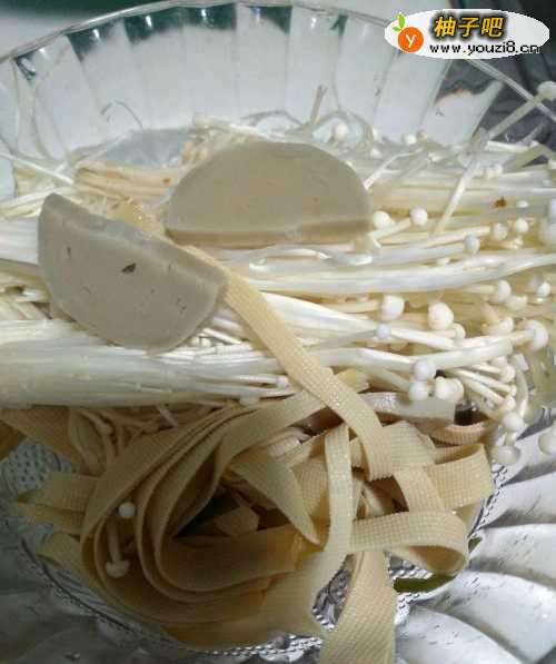 3丸子快熟时将金针菇 豆皮等易熟的原料放进锅内一起煮熟
