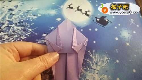 5把下面的部分向上折,并且把两侧的边向内折,如图一。我们把下侧的两个角向上折,如图二的样子。