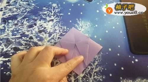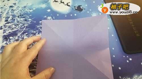 先把彩纸的中间折出米字形,按照折痕把彩纸折出图二的样子。