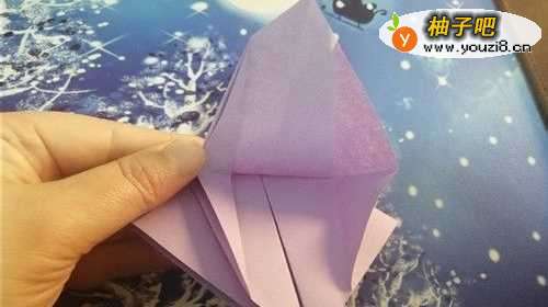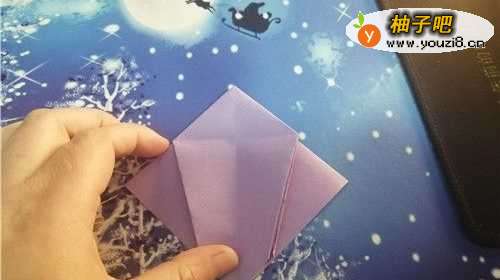 4我们把彩纸翻到另一面,按照上边的步骤一样操作。把左侧的边翻到右边,如图二。