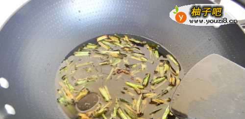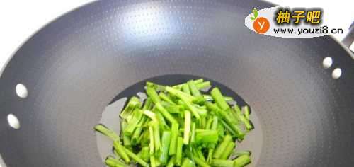 3锅烧热,倒入油,放入小葱段。要凉油放葱