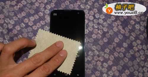 2然后拿擦布将手机屏幕擦干净,灰尘还是会落下来,主要清除手印,油污,有灰尘不用在意,稍后会处理好。