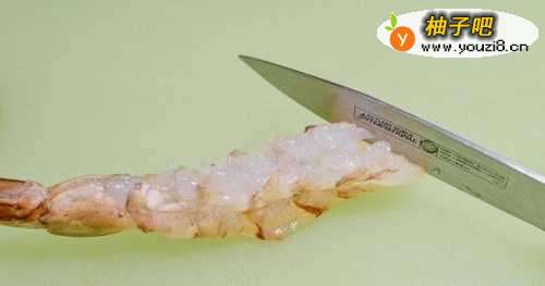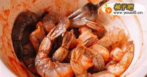 2处理干净的虾放入容器,加入泰式辣酱20g、蜂蜜5ml拌匀