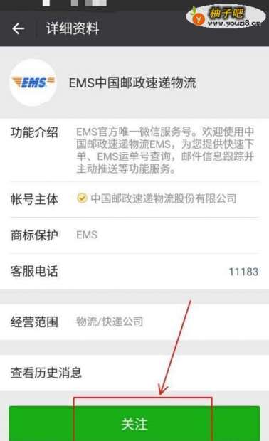 4输入“EMS中国邮政速递物流”,在出现的选择列表认准如下图所示的微信公众号,点击以准备添加。