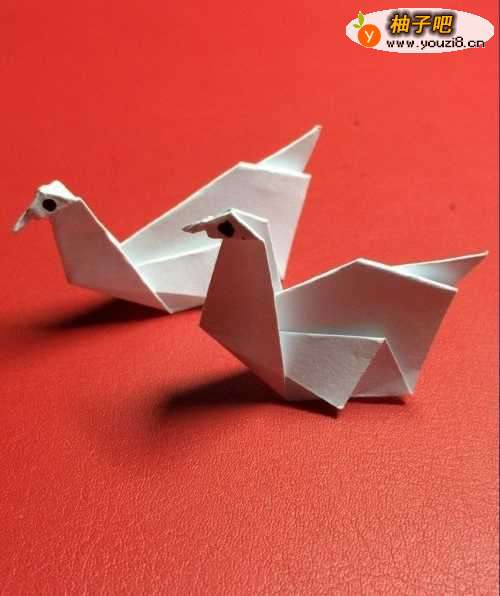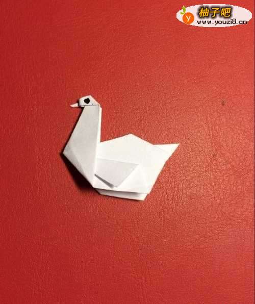 7然后,嘴巴尖尖处向后折叠一下,画上眼睛。再整理一下,立体的天鹅就折叠好了。
