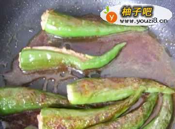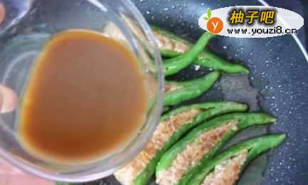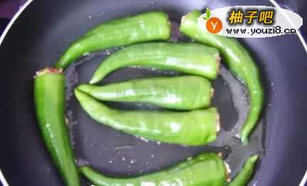 4平底锅放入食用油烧热,放入弄好肉馅的辣椒,有肉的一面朝下