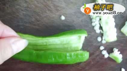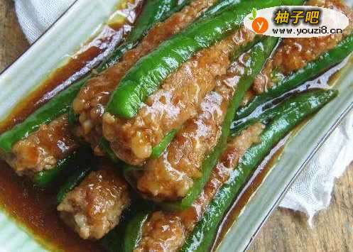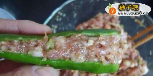 3辣椒洗净,去净内部的籽,用手掰开辣椒酿入肉馅,把辣椒填满肉馅
