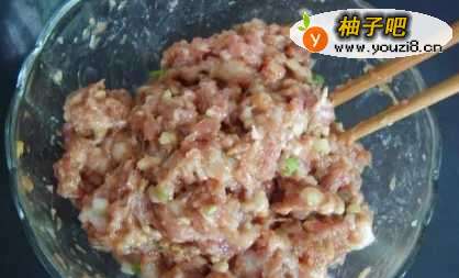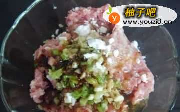 将猪肉洗净剁成肉沫,加入切碎的蒜、葱,再加入盐、糖、玉米淀粉、酱油、老抽、料酒、鱼露、鸡精、食用油、胡椒粉。