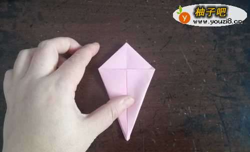 5再把角折上来,如图一。然后把彩纸从中间对折,如图二。