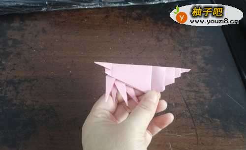 3我们把下边来回向上向下折,如图一。用剪刀把上边的角剪开,把角向外折,如图二。
