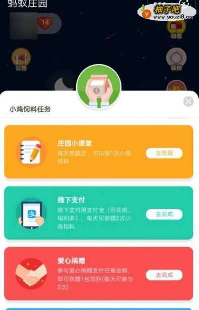 2喂养小鸡的饲料可以通过庄园小课堂,线下支付,爱心捐赠,线上支付,邀请好友