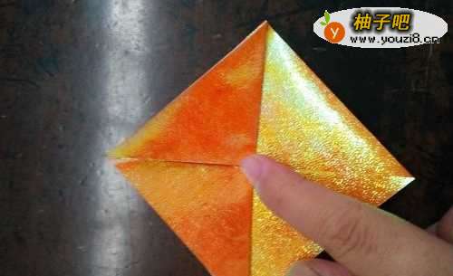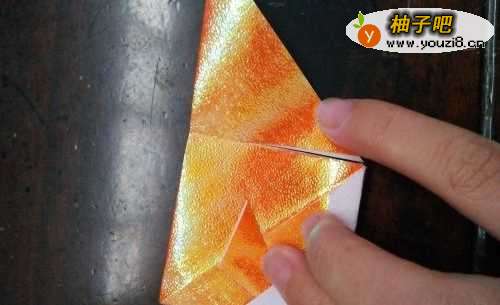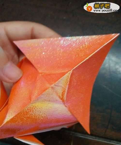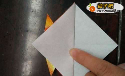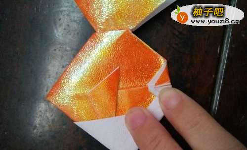 5然后,用手指从中间撑开,把鱼尾向内折。如图。