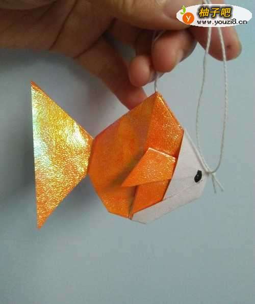 8我们再把鱼身体的下部向上折一下,再把它折进里边。我们给鱼画上眼睛,用针和线从鱼的底端穿上来即可。