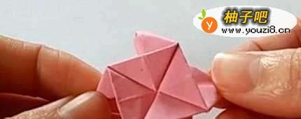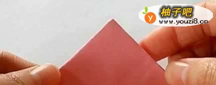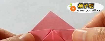 2将粉色的纸折叠对角,展开。沿着折痕折叠成这样。