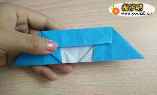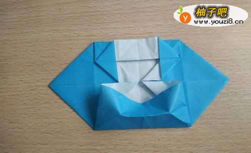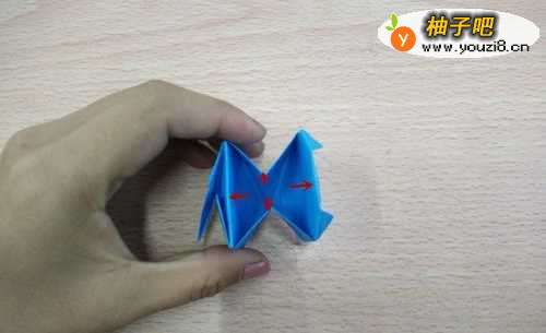 6将白色部分拉起来,撑开两边的三角形,将纸根据折痕往里压摺,最后形成如下图形。