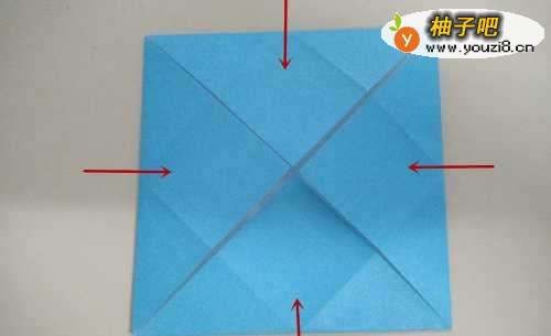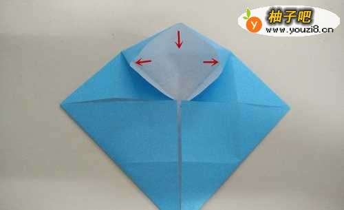 4将一个角从中间向两边打开,往下压成一个矩形,对角相同折法。