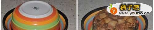 5待电压锅自动解压后。把蒸好的肉菜碗端出来,盖上大盘子。倒扣过来。