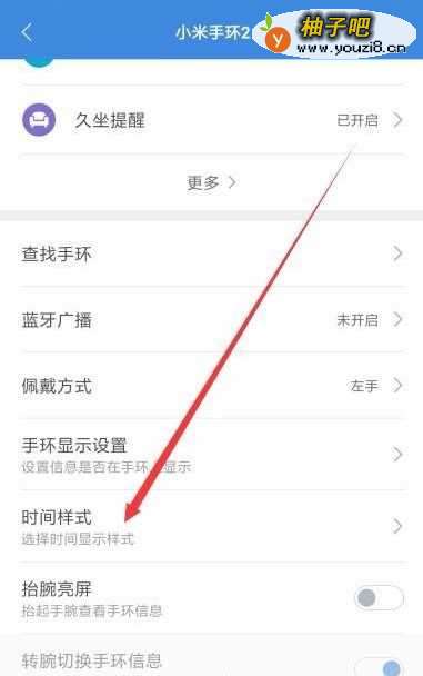 4这时会打开小米手环2的设置页面,向下拉动右侧的滚动条,可以看到“时间样式”菜单项,点击该菜单项