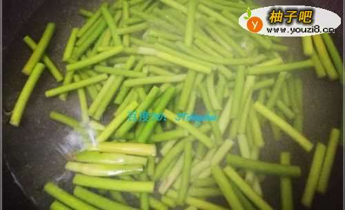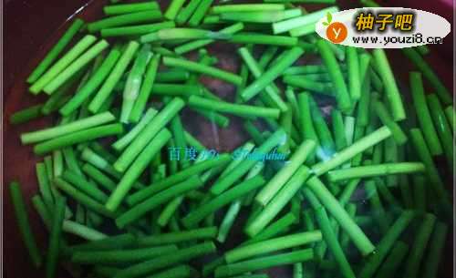 5将蒜薹段放入水中清洗干净,沥干备用。